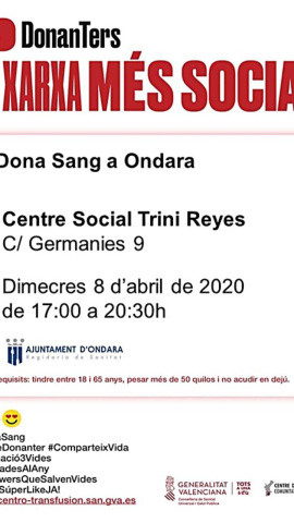 Se realizará este miércoles 8 de abril de 17 a 20.30 horas, en el Centro Social Trini Reyes de Ondara.