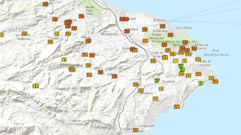 A primera hora de la mañana, los termómetros marcaban 25,8 grados en Pego, 25,6 en Pedreguer y Els Poblets, y 25,5 en Ondara, donde el ambiente era más propio de pleno verano que de finales de octubre.