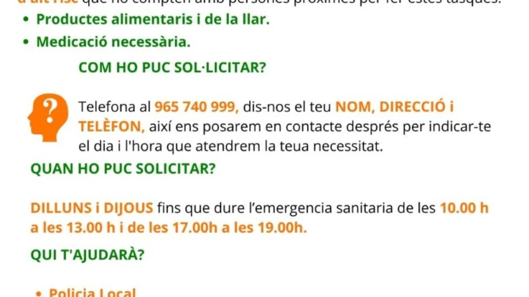 Para obtener este servicio, las personas tendrán que llamar al teléfono 965 740 999, el lunes o el jueves en horario de 10.00 a 13.00 horas y de las 17.00 a las 19.00 horas mientras dure la emergencia sanitaria.