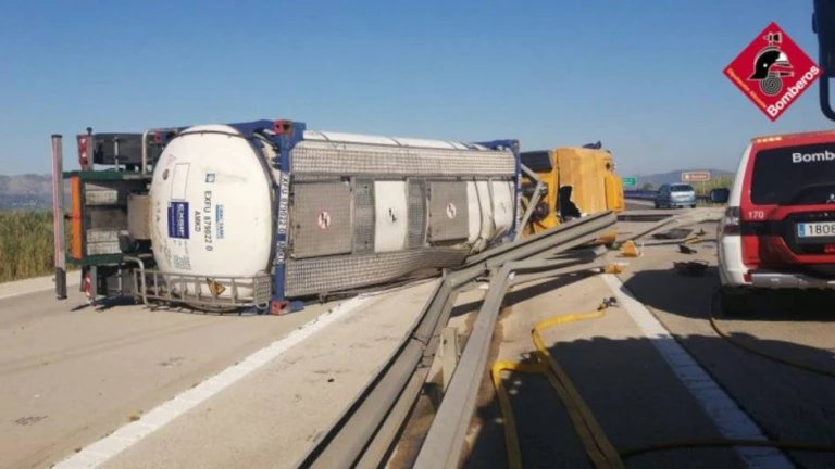 Un camión de gran tonelaje que transportaba gasóleo ha volcado hoy pasadas las 10 de la mañana en la antigua autopista AP-7, justo antes de sobrepasar el río Racons, en el término municipal de Dénia, concretamente en el linde de las provincias de Alicante y Valencia, según han informado fuentes del Consorcio de Bomberos.