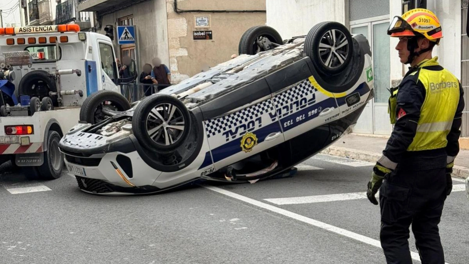 La avenida del País Valencià de Benissa ha sido escenario este miércoles de un aparatoso accidente que se ha saldado con un coche de la Policía Local totalmente volcado sobre la calzada. El siniestro, ocurrido a mediodía, ha provocado una importante congestión de tráfico en una de las vías principales de la localidad, según han alertado varios testigos.