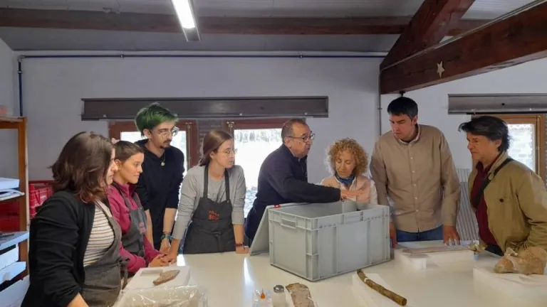 La directora del Instituto Valenciano de Conservación, Restauración e Investigación (IVCR+i), Gemma Contreras; el alcalde de Morella, Rhamsés Ripollés; el jefe de la sección de arqueología del IVCR+i, Rafael Martínez; y el paleontólogo local, Jose Miguel Gasulla; han visitado hoy el taller y visto el trabajo del equipo de restauración. Éste está contratado a través del programa EPRIEX, gestionado por el Servicio Valenciano de Empleo y Formación LABORA e impulsado por el IVCR+i, y trabajarán en el laboratorio situado en la Fábrica Giner hasta el mes de julio de este año 2023.