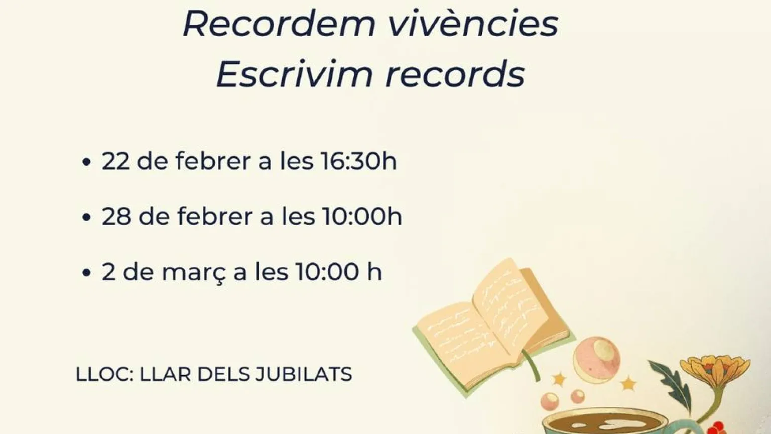 Así, mañana 22 de febrero a las 16.30h, el día 28 a las 10h y el 2 de marzo también a las 10h, se invita a la asistencia al Hogar del Jubilado para disfrutar de una merienda o un almuerzo, hablar y poner en común anécdotas y vivencias para, después, crear recuerdos colectivos que pervivan en la memoria de las futuras generaciones de Albocàsser.
