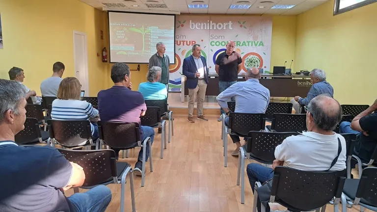 El encuentro técnico tuvo lugar en el salón de actos de la cooperativa benicarlanda y contó con la presencia del presidente de Caixa Benicarló, Vicent París, del presidente de Benihort, Sergio Ortiz, y del director general de Caixa Benicarló, José Manuel Galán, y del director general Benihort, Guillermo Edo. La profesionalización y digitalización en la agricultura del siglo XXI o la importancia de las cubiertas vegetales en el control biológico de cítricos son algunas de las cuestiones que se trataron en las charlas. Pero también la tecnología del riego por goteo subterráneo en cítricos y las herramientas necesarias para el uso eficiente del agua de riego y fertilizantes, mediante la sensórica, fueron otros de los temas escogidos en esta Jornada de Convivencia Cooperativa, cuyas charlas corrieron a cargo de expertos de la cooperativa Anecoop y de la firma Regaber.