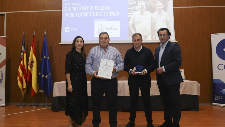 Josele Rubio y Lorena Bea, de Congelados Dil-DeCasa, entregaron el Premio GastroCOPE Castellón Toda una vida a Chimo y Javi, de Cafetería Centro de Castellón, quienes llevan 48 años como socios, iniciando su relación profesional en el servicio de restauración del desaparecido Lemon, donde permanecieron durante 13 años, y desde el cierre del centro comercial comparten proyecto en la calle Vera.