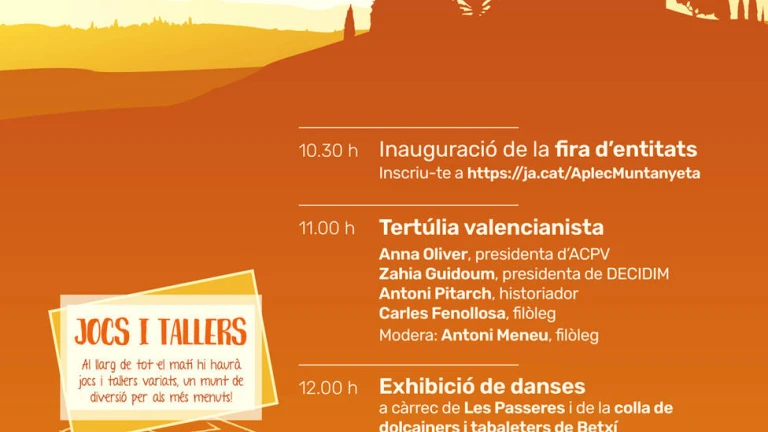 La jornada comenzará con una feria de entidades que se inaugurará a las 10.30h. Posteriormente, dará comienzo la tertulia política a las 11.00h donde participaran la presidenta d’ACPV, Anna Oliver, la presidenta de Decidim, Zahia Guidoum, el historiador Antoni Pitarch y el filólogo Carles Fenollosa; bajo la tutela de Antoni Meneu.