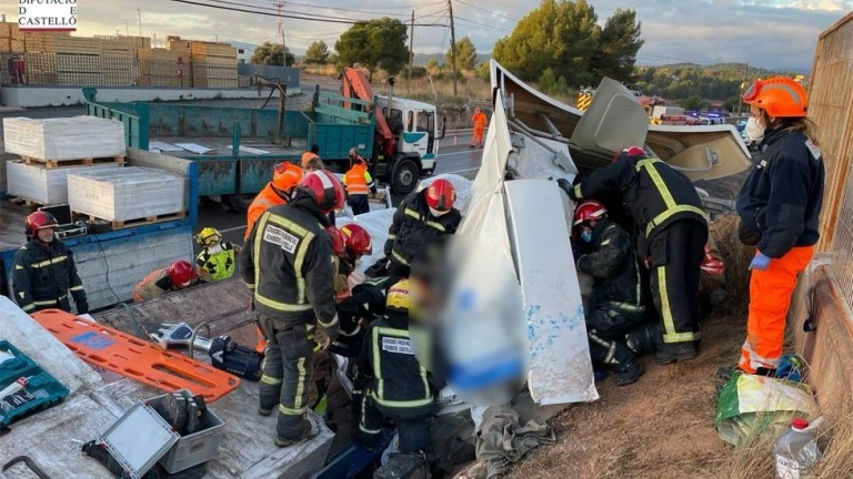 Bomberos requieren de más de cuatro horas para rescatar al conductor de un camión accidentando en Castellón
