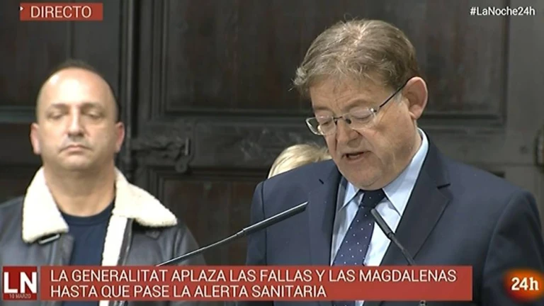 Hacia las 22:00 horas del martes comparecía en rueda de prensa desde el Palau de la Generalitat, el jefe del Consell Ximo Puig, quien anunciaba la suspensión o aplazamiento de las Fallas y de las Fiestas de la Magdalena.