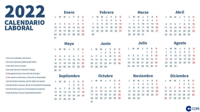 En COPE.es te exponemos a continuación cuál es el calendario laboral 2022 aprobado por el Gobierno a nivel nacional, con los festivos autonómicos y locales. De esta manera, sabrás de un simple vistazo qué días festivos te pertenecen en 2022 con el objetivo de ir planificando tus vacaciones o tus escapadas.