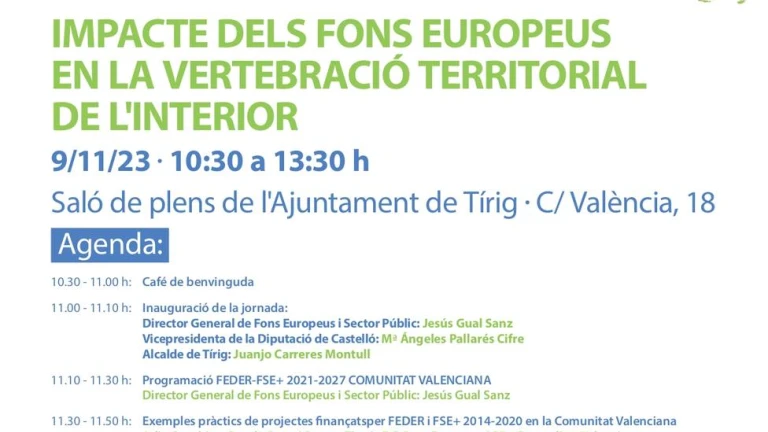 La Conselleria de Hacienda, Economía y Administración Pública, a través de la Dirección General de Fondos Europeos y Sector Público, organiza este próximo jueves 9 de noviembre en la localidad de Tírig el evento ‘Impacto de los Fondos Europeos en la vertebración territorial del interior’, en coordinación con la Diputación de Castellón y Europe Direct Castellón.