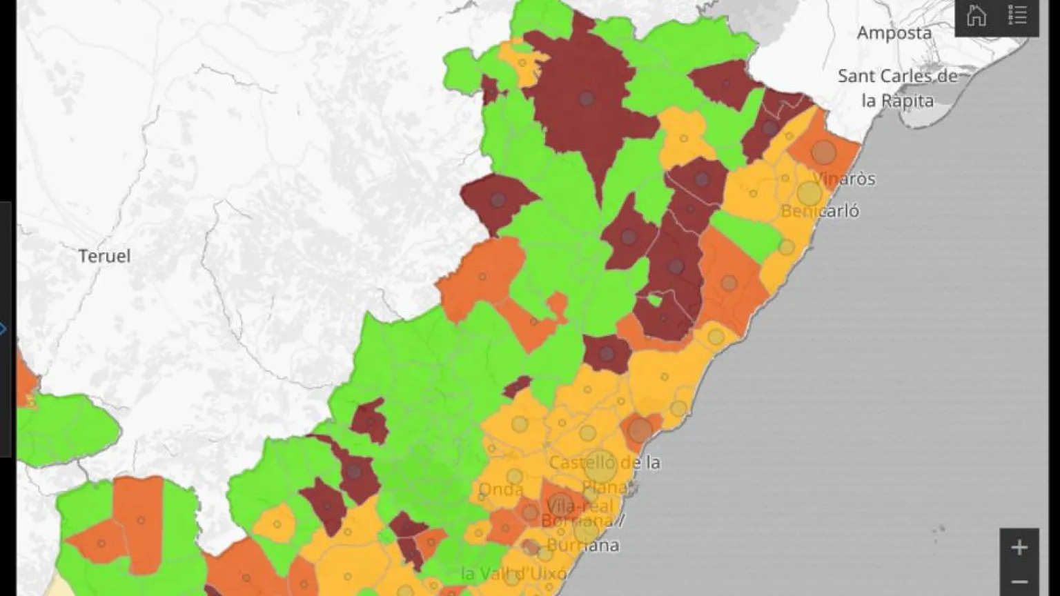 Ante todo ello, gran parte del interior de Castellón empieza a lucir verde, lo que supone no contar con ningún caso activo de Covid-19, mientras que en el litoral sólo alcanza dicho nivel La Llosa.