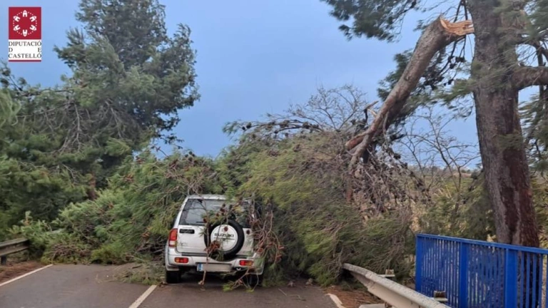 Las fuertes rachas de viento han causado la caída, prácticamente completa, de un pino de grandes dimensiones sobre un vehículo mientras circulaba en Nules, aunque la conductora ha podido salir ilesa y por sus propios medios. Bomberos trabajan en retirada de persianas una persiana en Vila-real; en el saneamiento de cornisas en Oropesa del Mar y Onda o de sendos árboles en Jérica y Benafer.