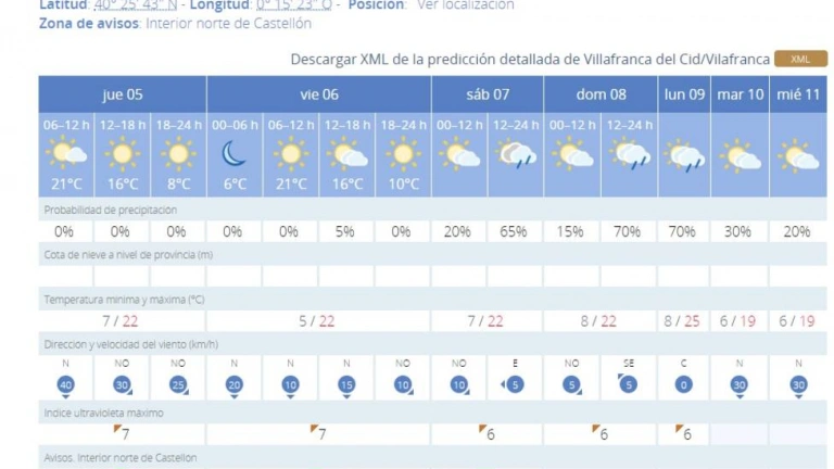 De hecho, poblaciones como Morella que vienen registrando mínimas de entre 13ºC y 14ºC, verán la próxima madrugada como los termómetros descienden hasta los 8ºC. Incluso bajarán de forma más importante en localidades como Vilafranca donde prácticamente se asomarán al invierno con valores de solo 5ºC.