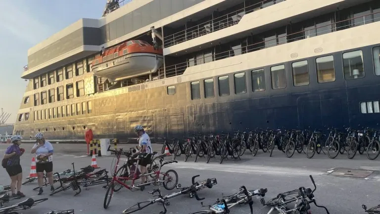 Este jueves el puerto de Castellón ha recibido al crucero 'World Navigator', haciendo escala, para desembarcar a ciclistas que se dirigen a la EuroVelo 8