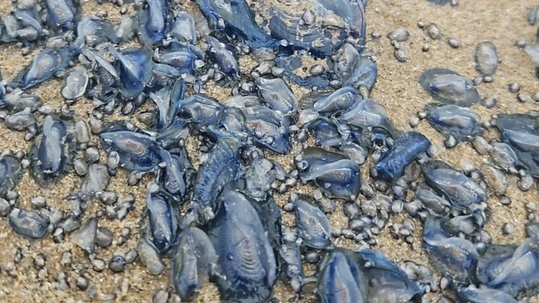 El temporal de la pasada semana arrastra a numerosas playas de la provincia miles de ejemplares de medusas velero, destacadas por sus tonos azulados.