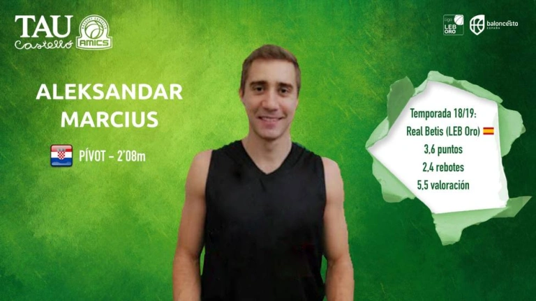 Con ello, el Tau Castelló apuesta por el croata Aleksandar Marcius, que a sus 29 años vivirá una nueva experiencia en el basket español. Así, el de Nedelišće, tras su paso por el baloncesto universitario estadounidense en Purdue y DePaul, dio el salto al profesionalismo en el Sibernik de su país natal, para en la campaña 2015-16 enrolarse en el Sammic ISB de la LEB Plata, donde promedió más de 20 de valoración.