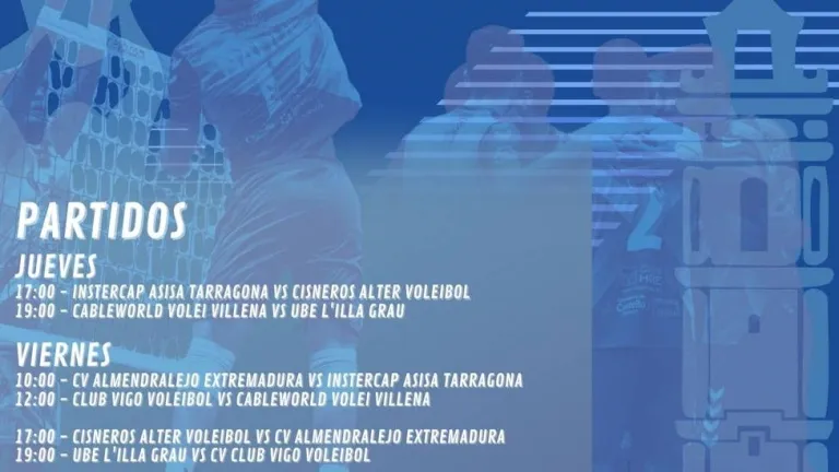 Los seis mejores conjuntos de la Superliga Masculina 2 se darán cita este fin de semana en el Pabellón de la Ciutat Esportiva de Castellón para disputar la Fase Final de la categoría de plata del vóley masculino. Instercap Asisa Tarragona, Cisneros Alter Voleibol, Cableworld Volei Villena Petrer, CV Almendralejo Extremadura, Club Vigo Voleibol junto al anfitrión UBE L´Illa Grau inician la gran batalla por levantar el trofeo de campeón de la categoría y lograr uno de los dos billetes hacia la Superliga Masculina.