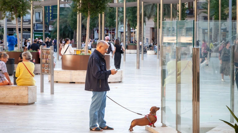 Un anciano guía a su perro salchicha por una concurrida plaza.