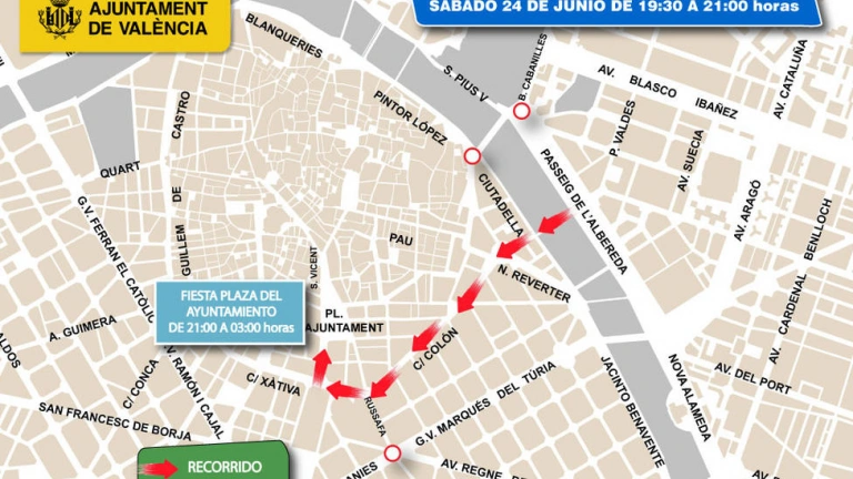 El Ayuntamiento de València ha previsto un dispositivo de tráfico con motivo de la manifestación del Orgullo LGTBI+ que recorrerá València el sábado, 24 de junio, desde las 19:30 horas. La manifestación recorrerá el paseo de la Alameda, el puente de la Exposición, la calle del Justicia, la plaza de la Porta del Mar, la calle de Colón, la calle de Xàtiva, la avenida del Marqués de Sotelo y, finalmente, la plaza del Ayuntamiento, donde hay prevista una fiesta.