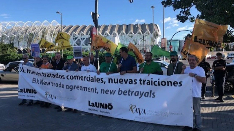 Cristobal Aguado (AVA) y Carles Péris (Unió) protestan ante las 27 ministros de Comercio de la UE