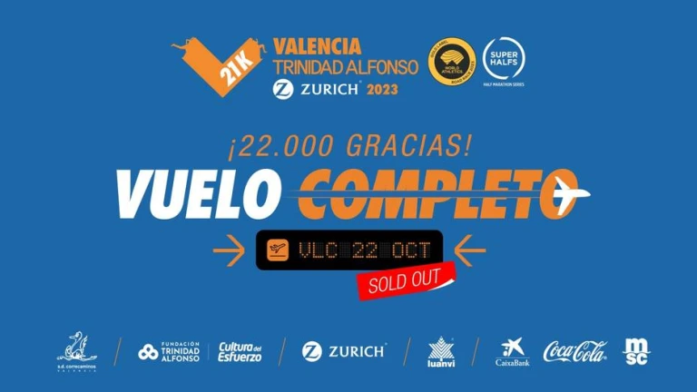 El Medio Maratón Valencia Trinidad Alfonso Zurich, organizado por la SD Correcaminos, ha agotado sus 22 000 dorsales disponibles seis meses antes de su celebración el próximo 22 de octubre. El mejor 21K de España y el más rápido del mundo ha llegado al sold out por quinto año consecutivo y vuelve a crecer en participantes con 2000 más que en 2022.