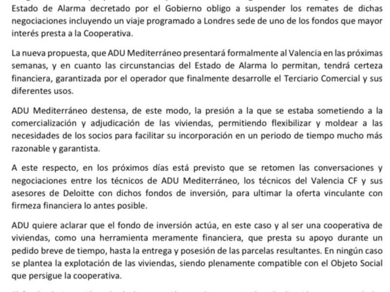 Faltaba por escuchar a la otra parte y ya se ha pronunciado. La cooperativa ADU Mediterráneo que ha lucido una actitud optimista casi hasta el último tramo de la carrera, no ha querido desvestirse de ese traje de positividad y, a través de un comunicado público de tres páginas, ha venido a confirmar que no han abandonado la competición y que, sin ir más lejos, "la nueva propuesta, que ADU Mediterráneo presentará formalmente al Valencia en las próximas semanas, y en cuanto las circunstancias del Estado de Alarma lo permitan, tendrá certeza financiera, garantizada por el operador que finalmente desarrolle el Terciario Comercial y sus diferentes usos". Se añade que varios fondos de inversión han mostrado su interés para la adquisión de los más de 50.000 metros cuadrados del terciario comercial.