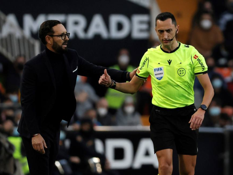 Bordalás (i) conversa con el árbitro José María Sánchez Martínez (d). EFE/ Juan Carlos Cárdenas