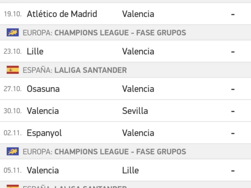 En este tramo de competición también habrá un duelo ante un rival directo como el Sevilla (30 de octubre) que se jugará en Mestalla, sin olvidar, por supuesto, el doble duelo de Champions que se antoja fundamental tal y como están las cosas en el grupo H, frente al Lille en tierras galas (miércoles 23) y en Mestalla (martes 5 de noviembre).