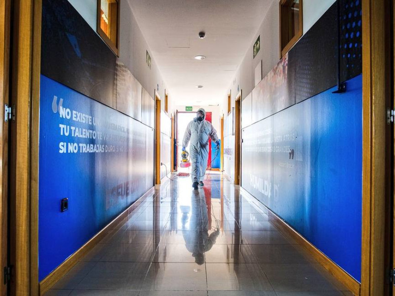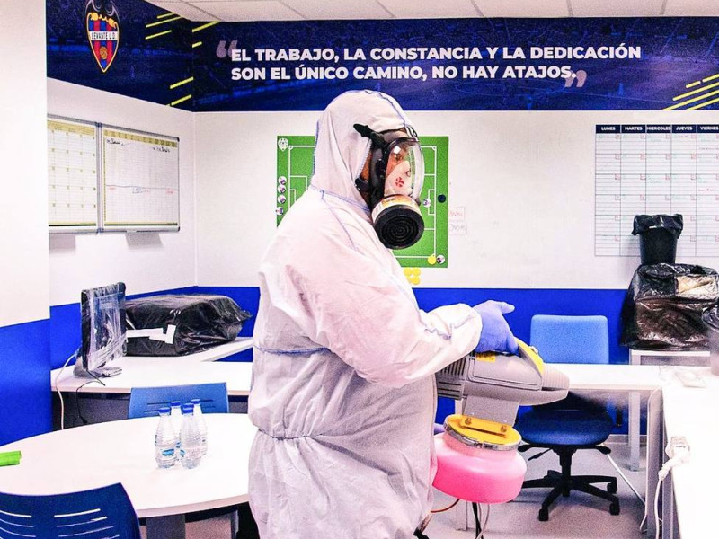El Levante UD empezó ya el lunes a limpiar la ciudad deportiva y ha enseñado en un video como varios empleados completamente protegidos con un traje EPI desinfectan todas las máquinas y materiales de trabajo del gimnasio del primer equipo, así como el despacho del entrenador Paco López y el resto de miembros del cuerpo técnico del Levante UD.