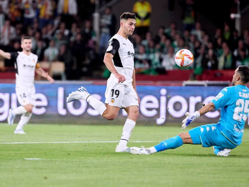 Reaccionó bien el Valencia que no perdió la cara al partido a pesar del revés. Más por corazón que por fútbol y con Guedes como estilete, siguió asomando por el área bética. La recompensa llegó a la media hora de juego. Soler recupera y asiste a Ilaix Moriba que filtra un balón entre la defensa verdiblanca que deja solo a Hugo Duro en el mano a mano con Claudio Bravo. La definición es exquisita del getafense que la pica por encima del chileno marcando un auténtico golazo y empatando el marcador de La Cartuja. 1-1.