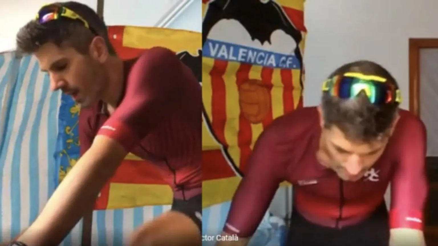Posteriormente recorrió 90 kilómetros sobre una bicicleta con rodillo y lo hizo junto a una gran bandera del Valencia CF y acabó la prueba corriendo en cinta 21 kilómetros.
