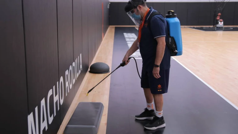 15 personas han sido y siguen siendo los artífices de este "milagro". La jornada laboral arranca a las ocho de la mañana con la comprobación de que las máscaras, los guantes y demás están en perfecto estado y en su sitio. Se desinfectan las máquinas de tiro, los balones, los tablero, los aros "y todo lo que sea susceptible de ser tocado por los jugadores" tal y como explica Vicente Giner, el delegado de pistas.