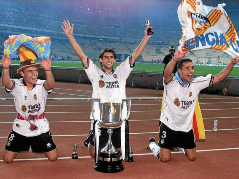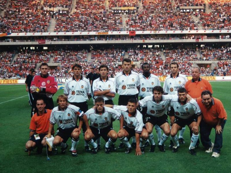 Aquel equipo de leyenda se impondría después al FC Barcelona en la Supercopa. Tras el 1-0 de Mestalla en la ida, el Valencia CF, entrenado ya por Héctor Cúper, empató a tres en el Camp Nou en un partido loco. Había nacido una generación de éxito y que
