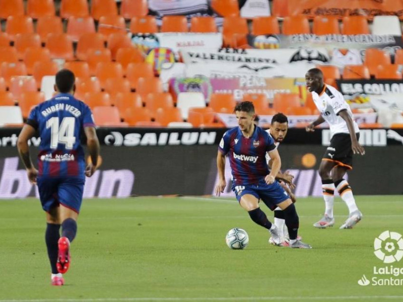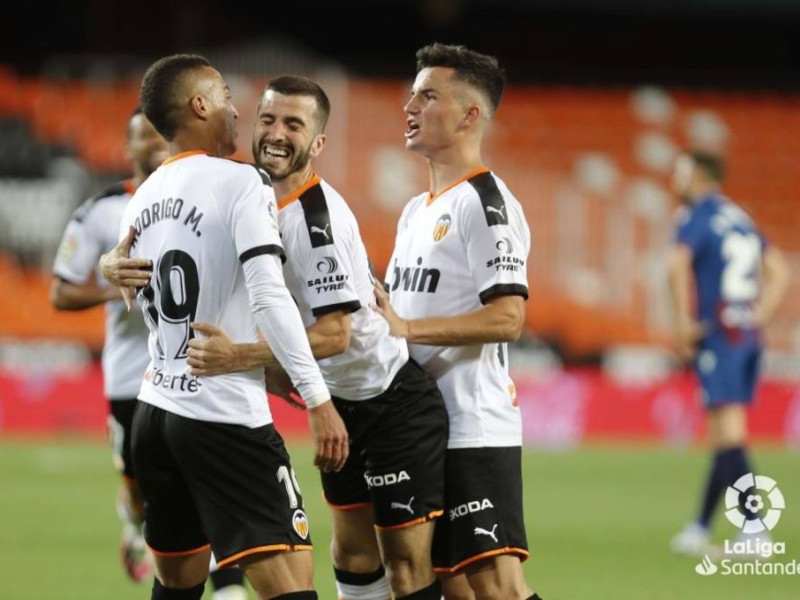 En un extraño e inédito derbi jugado por vez primera en la historia sin público en las gradas, el partido entero se ha concentrado en seis minutos. Los que han ido del 89 al 95. En ese tramo han ocurrido infinidad de cosas. Una extraordinaria jugada iniciada por Hugo Guillamón (¡vaya partido ha hecho el chaval!) con un pase entre líneas al alcance de muy pocos, continuida magistralmente por José Luis Gayá (otra vez el mejor de los ches) con una asistencia bañada en oro y con un dificilísimo remate en caída con la izquierda de Rodrigo Moreno que, previo golpeo en el poste, acaba dentro de la portería del Levante UD (ASÍ HA SONADO EN TIEMPO DE JUEGO).