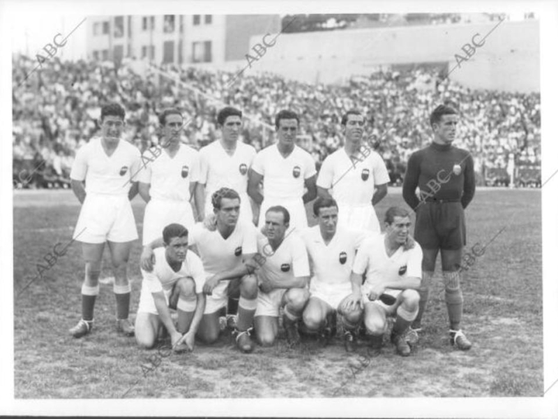 Alineación del Valencia CF: Pío, Álvaro, Juan Ramón, Bertolí, Sierra, Lelé, Epi, Amadeo, Mundo, Asensi y Gorostiza