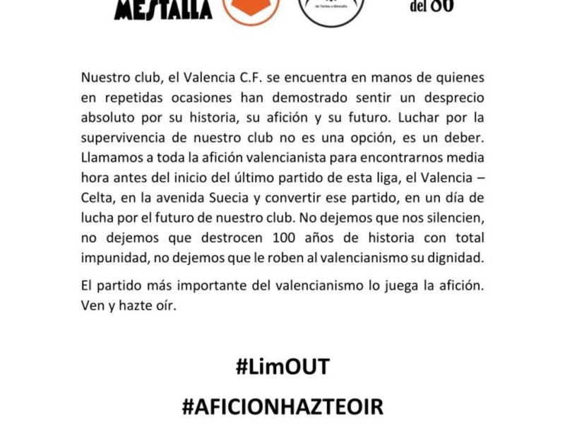 "Nuestro club, el Valencia CF, se encuentra en manos de quienes en repetidas ocasiones han demostrado sentir un desprecio absoluto por su historia, su afición y su futuro. Luchar por la supervivencia de nuestro club no es una opción, es un deber. Llamamos a toda la afición valencianista para encontrarnos media hora antes del inicio del último partido de esta liga, el Valencia-Celta, en la Avenida de Suecia y convertir este partido en un día de lucha por el futuro de nuestro club. No dejemos que nos silencien, no dejemos que destrocen 100 años de historia con total impunidad, no dejemos que le roben al valencianismo su dignidad. El partido más importante del valencianismo lo juega la afición. Ven y hazte oír. LIMOUT. LIMGOHOME. AFICIONHAZTEOIR". Éste es el mensaje que se ha hecho público y que trata de aglutinar al mayor número de valencianistas posible en la enésima manifestación contra la propiedad singapurense del club.