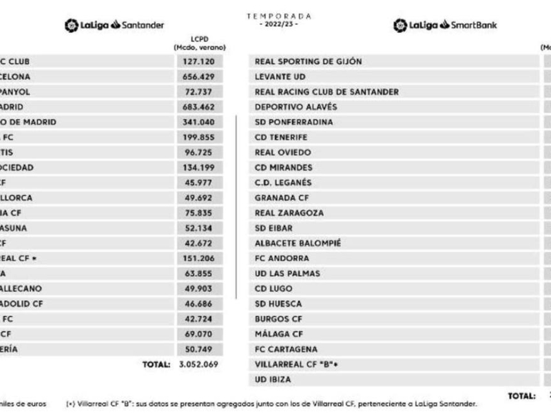 En la tarde de hoy, una vez finalizado el periodo de fichajes de verano, LaLiga ha hecho públicos los límites de coste de plantilla deportiva (LCPD) de los clubes y SAD de LaLiga Santander y LaLiga Smartbank, además de explicar todos los detalles vinculados a ese control económico. Javier Tebas, presidente de LaLiga, y Javier Gómez, director General Corporativo de LaLiga, han explicado a los medios de comunicación cuáles son los límites del coste de plantilla que cada club puede consumir durante la temporada.