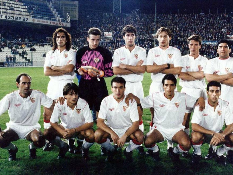 Equipo del Sevilla FC con Pineda y Maradona juntos