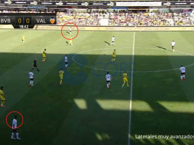 2. Laterales profundos y extremos con movilidad. Gattuso coloca a los laterales en la línea de medios para dar mucha profundidad en la salida de balón. Es una de las cuestiones que se ha visto patente en los primeros días de trabajo en la Ciudad Deportiva. Los centrocampistas dan líneas de pase y los extremos recorren espacios interiores para generar superioridades y poder avanzar. En una acción de esa índole llegó el primer gol del Valencia CF.