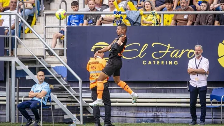 El Valencia intentó desplegar juego en el campo contrario con más frecuencia de la que había mostrado anteriormente, bajo la manija de Nico González, pero el equipo gaditano volvió a echarse arriba y en una acción ensayada tras saque de banda marcó el primer gol del partido.
