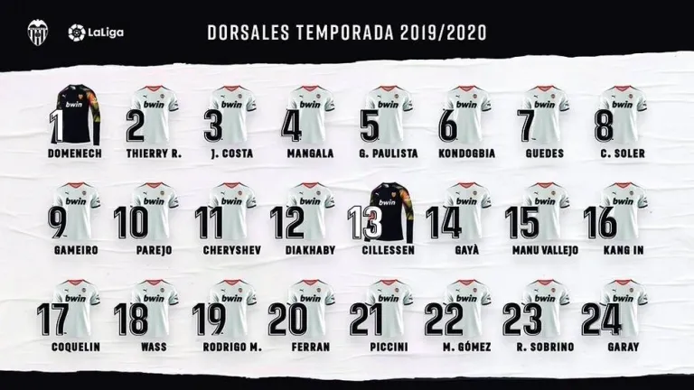 El Valencia CF ya ha dado a conocer la suya, con algunos cambios destacables. El último en llegar, Thierry Correia (aparecerá Thierry R. en la camiseta) lucirá el dorsal 2, que deja Manu Vallejo para quedarse con 15, Eliaquim Mangala llevará el 4 y Rubén Sobrino que se ha quedado, pese a no contar para el cuerpo técnico, mantendrá el 23.