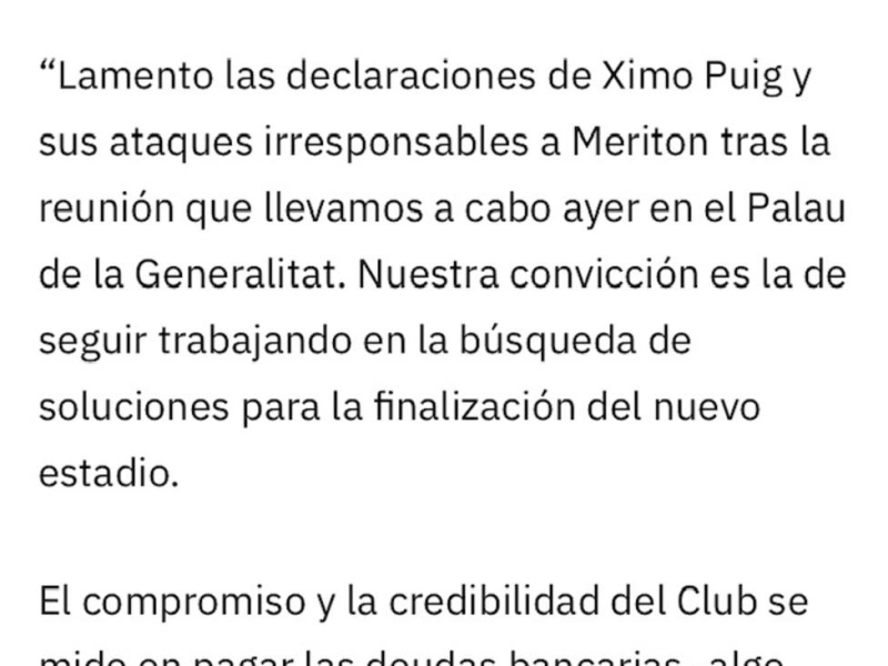 "Lamento las declaraciones de Ximo Puig y sus ataques irresponsables a Meriton (...) El compromiso y la credibilidad del Club se mide en pagar las deudas bancarias -algo que nadie hacía antes- ayudar a la sociedad valenciana especialmente durante la crisis del COVID-19 o donar material sanitario a los hospitales de la Comunitat Valenciana cuando no había debido a una gestión inadecuada de la crisis, por ejemplo" se puede leer en el texto.
