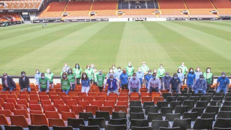 Los voluntarios posan en la grada de Tribuna de Mestalla