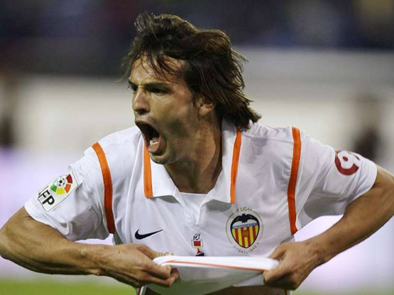 Morientes celebra un gol con el Valencia CF