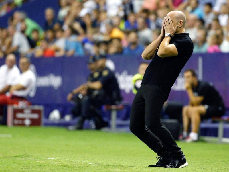 Paco López se tapa la cara en un partido con el Levante UD