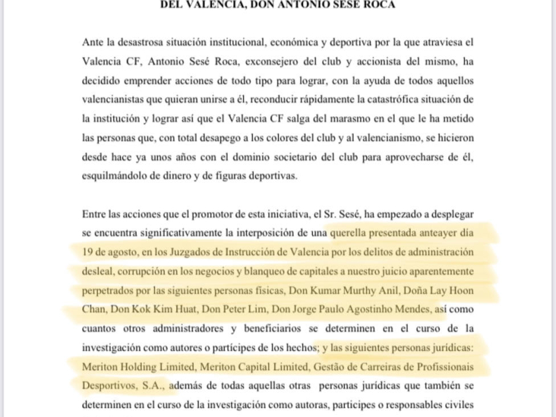 Sin embargo en todo este tiempo, es la primera vez que un accionista da el paso al frente para intentar llevar a los tribunales la gestión llevada a cabo desde octubre de 2014. Ha sido Antonio Sesé, empresario y consejero del club en 2012, quien se ha decidido. Y va a por todas. Acusa a Peter Lim, Anil Murthy, el ex consejero delegado Kim Koh, la ex presidenta Layhoon Chan y el representante Jorge Mendes nada menos que de los siguientes presuntos delitos: administración desleal, corrupción en los negocios y blanqueo de capitales. La querella que fue presentada el día 19 en los Juzgados de Instrucción de Valencia también va dirigida a estas personas jurídicas: Meriton Holding Limited, Meriton Capital Limited y Gestao de Carreiras de Profissionais Despostivos (conocida como Gestifute).