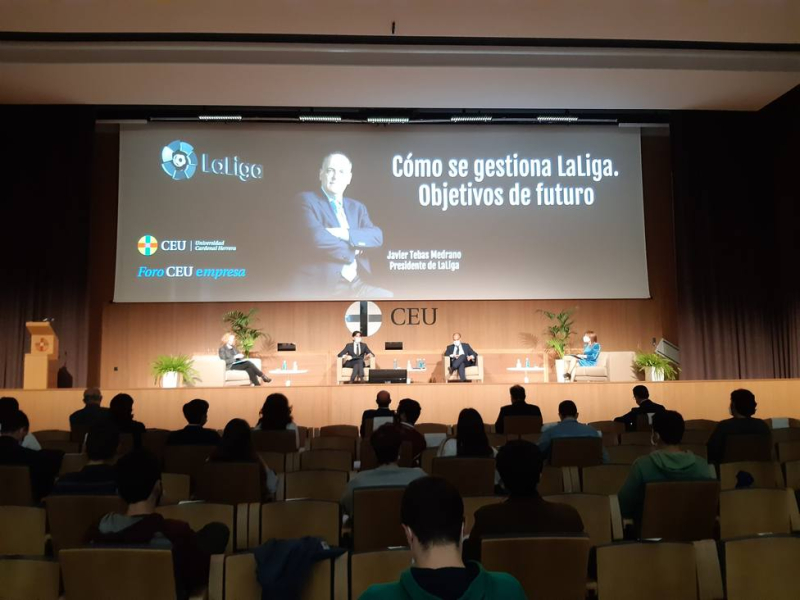 El presidente de LaLiga, Javier Tebas, ha sido el protagonista de una ponencia en el Paraninfo de la Universidad CEU Cardenal Herrera bajo el título “Cómo se gestiona LaLiga y sus objetivos de futuro”.