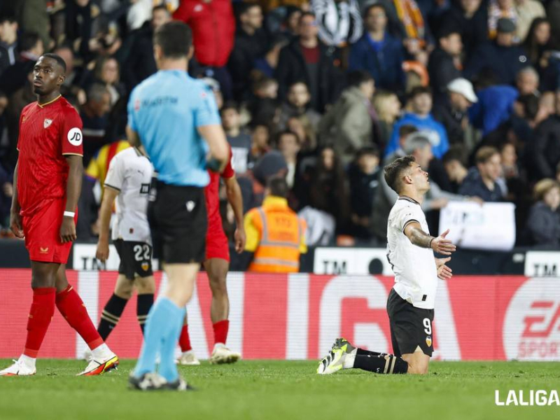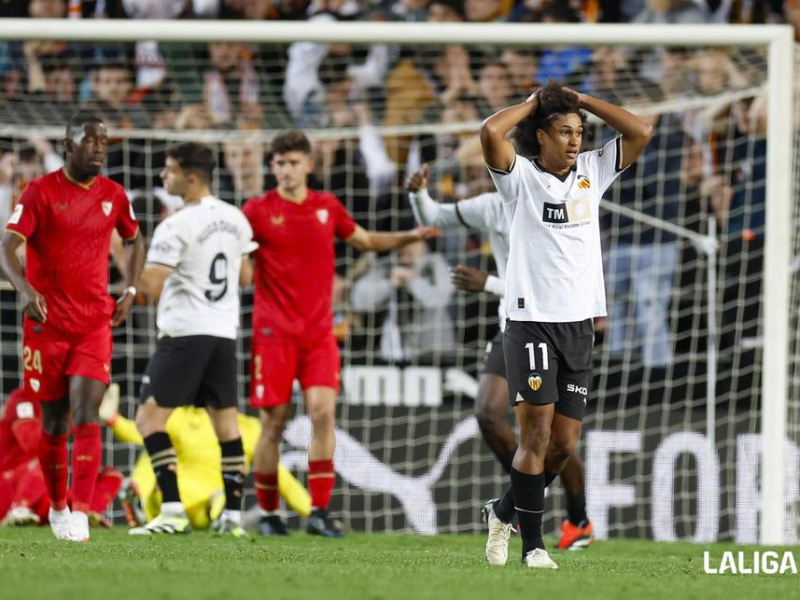 Poco a poco, el Sevilla empezó a incomodar al Valencia con una presión alta que hacía dudar a Mamardashvili y obligó a Mosquera a salir al rescate para cortar un centro con la testa de manera muy poco ortodoxa después de una buena presión de Isaac sobre Diakhaby. Ese ímpetu inicial se diluyó y las fuerzas se igualaron en Mestalla, donde ninguno quería conceder oportunidades.