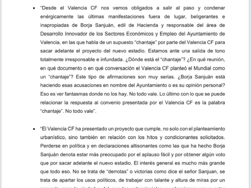 Una entrevista al concejal de Haciendo del Ayuntamiento de Valencia, Borja Sanjuán, concedida a Plaza Deportiva ha hecho saltar las alarmas en el seno del Valencia CF que ha decidio reaccionar con dureza a las sospechas vertidas en torno a futuribles chantajes que pueda llevar a cabo Meriton, como mayor accionista del club, valiéndose de la cita mundialista de 2030 para lograr beneficios con la posible reanudación de las obras del Nou Mestalla.