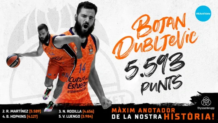 Y tras varios intentos fallidos, llegó el momento del partido. Mientras se empezaba a certificar el triunfo local, se produjo un triple frontal conseguido por Bojan Dubljevic que pasará a los anales. Con esos puntos, el valenciano de Niksic como le gusta ser llamado, se convertía en el máximo anotador de todos los tiempos en Valencia Basket superando a su buen amigo Rafa Martínez. 5.593 puntos en nueve temporadas. Leyenda viva del baloncesto.